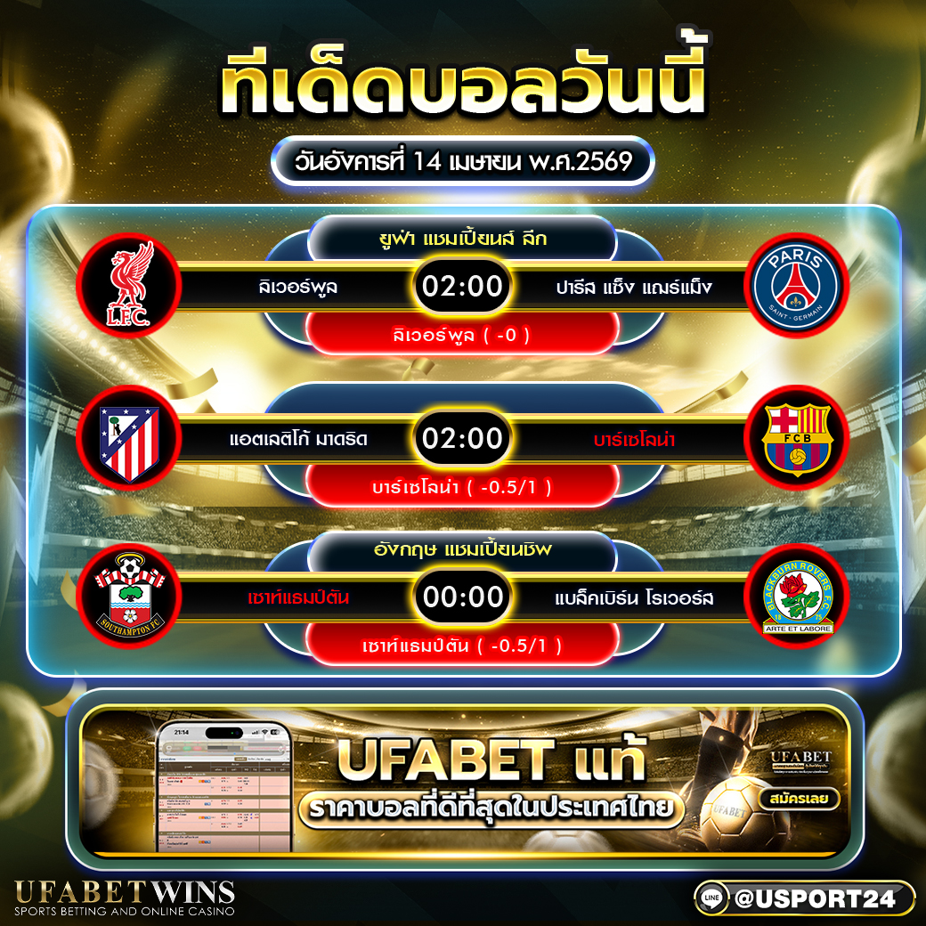 บทสรุปของหน้า ทีเด็ดบอลวันนี้ 14 เม.ย. 2569 คือค่ำคืนนี้มีทั้งความเข้มข้นของเกมใหญ่ยุโรปและความชัดเจนของคู่บอลต่อจากลีกอังกฤษรวมอยู่ในหน้าเดียว โดยแนวทางสำคัญของวันประกอบด้วย เสมอ ลิเวอร์พูล ในเกมพบ ปารีส แซงต์ แชร์กแมง, ต่อ บาร์เซโลน่า ในเกมพบ แอตฯ มาดริด และ ต่อ เซาแธมป์ตัน ในเกมพบ แบล็คเบิร์น โรเวอร์ ซึ่งทั้งสามคู่ต่างมีบทบาทคนละแบบในการทำให้หน้าทรรศนะคืนนี้มีความครบถ้วน ทั้งในมุมของชื่อชั้น ความสูสี และระดับความชัดเจนของอัตราต่อรอง
