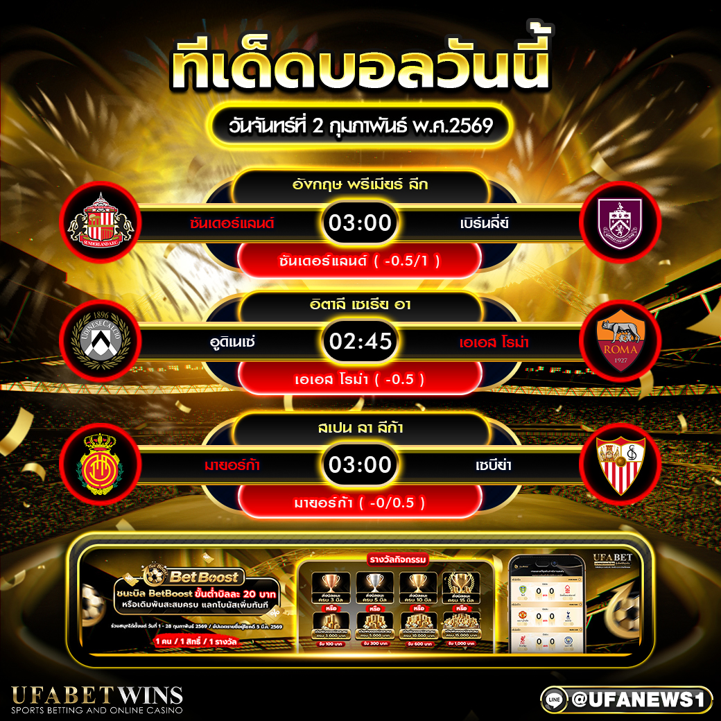 ทีเด็ดบอลวันนี้ คืนวันจันทร์ที่ 2 กุมภาพันธ์ พ.ศ. 2569 แม้จะเป็นคืนวันทำงาน แต่ยังคงมีโปรแกรมฟุตบอลยุโรปที่น่าสนใจลงสนามพร้อมกันจากหลายลีกชั้นนำ ทั้งพรีเมียร์ลีก อังกฤษ, กัลโช่ เซเรีย อา อิตาลี และลา ลีก้า สเปน บทความนี้ได้คัดเลือก 3 คู่เด่นที่มีความน่าสนใจในแง่ของรูปเกมและอัตราต่อรอง มาเรียบเรียงเป็นแนวทางการวิเคราะห์ก่อนการแข่งขัน เพื่อให้ผู้อ่านสามารถใช้ข้อมูลเหล่านี้ประกอบการติดตามเกมได้อย่างมีอรรถรสและเข้าใจบริบทของแต่ละคู่มากยิ่งขึ้น