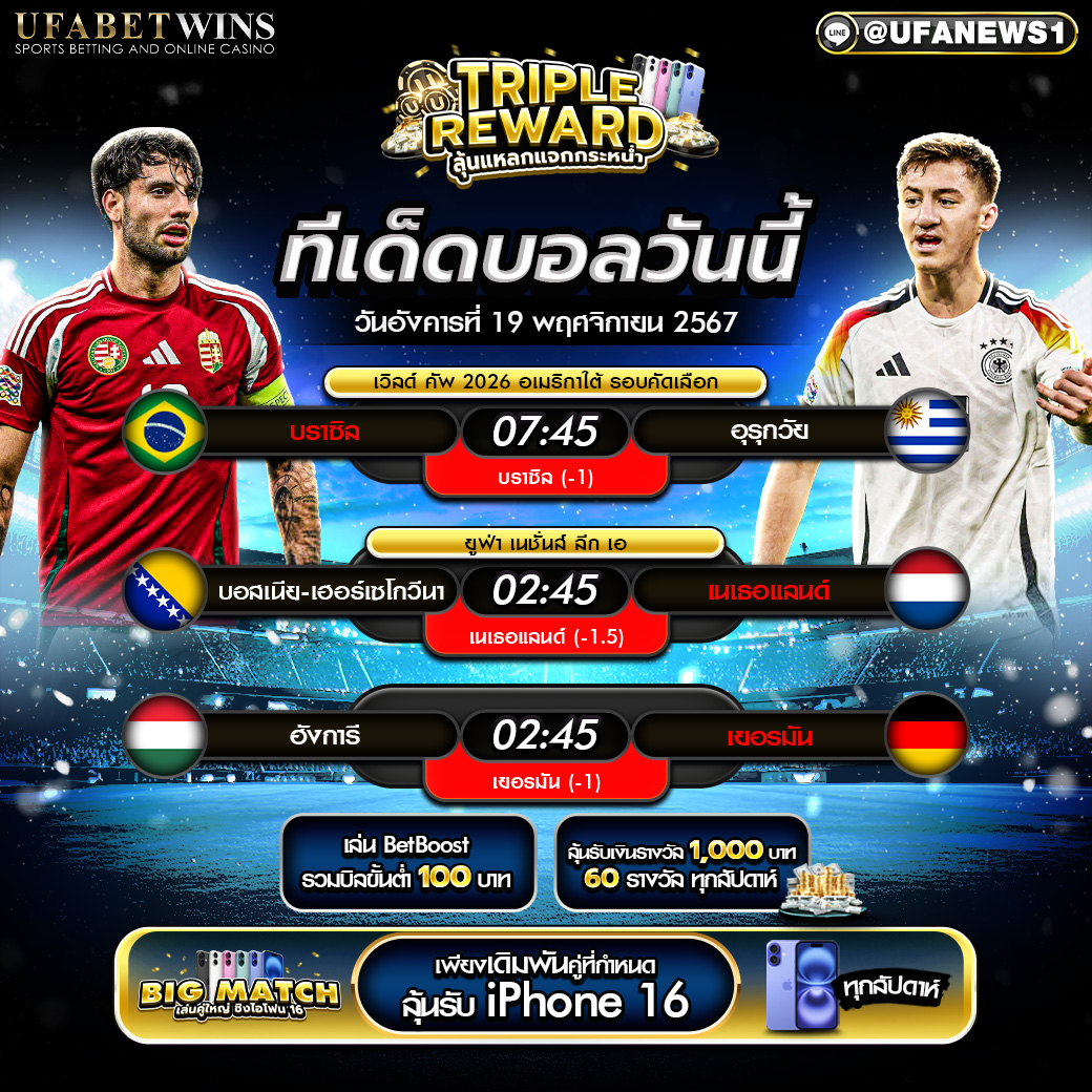 ทีเด็ดบอลวันนี้สำหรับการแข่งขัน เวิลด์ คัพ 2026 อเมริกาใต้ รอบคัดเลือก เวลา 07:45 น. บราซิล พบ อุรุกวัย อัตราต่อรอง -1 ทีเด็ดบราซิล และยูฟ่า เนชั่นส์ ลีก เอ เวลา 02:45 น. บอสเนีย-เฮอร์เซโกวีนา พบเนเธอร์แลนด์ อัตราต่อรอง -1/1.5 ทีเด็ดเนเธอร์แลนด์ รวมถึง ฮังการี พบ เยอรมนี อัตราต่อรอง -1 ทีเด็ดเยอรมนี