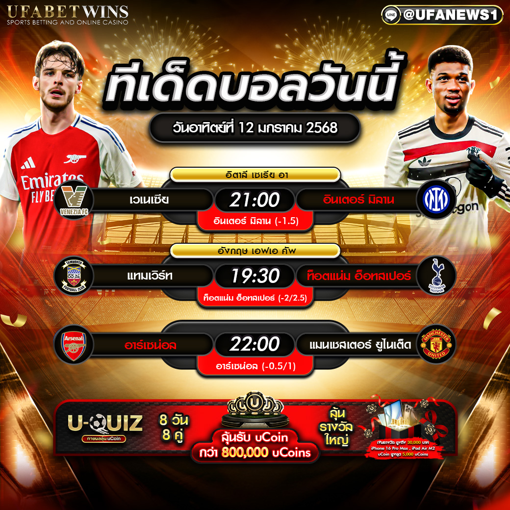 ทีเด็ดบอล วิเคราะห์บอลวันนี้ 12/01/2568 คืนนี้มีฟุตบอล ลงแข่งมากพอสมควร UFANEWS คัดมาให้เน้นๆ 3 คู่ ไปดูกันเลย