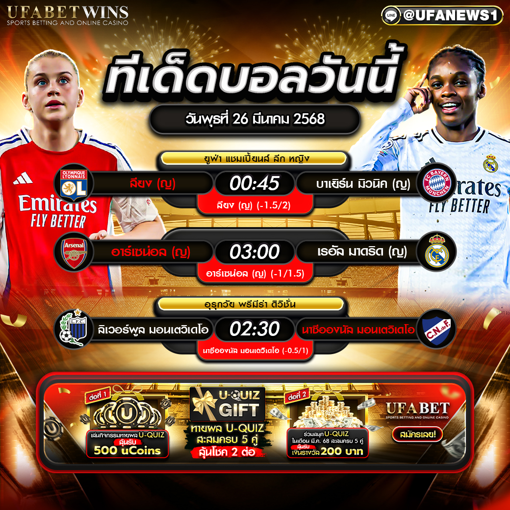 ทีเด็ดบอล วิเคราะห์บอลวันนี้ 26 มีนาคม 2568 คืนนี้มีฟุตบอล ลงแข่งมากพอสมควร UFANEWS คัดมาให้เน้นๆ 3 คู่ ไปดูกันเลย