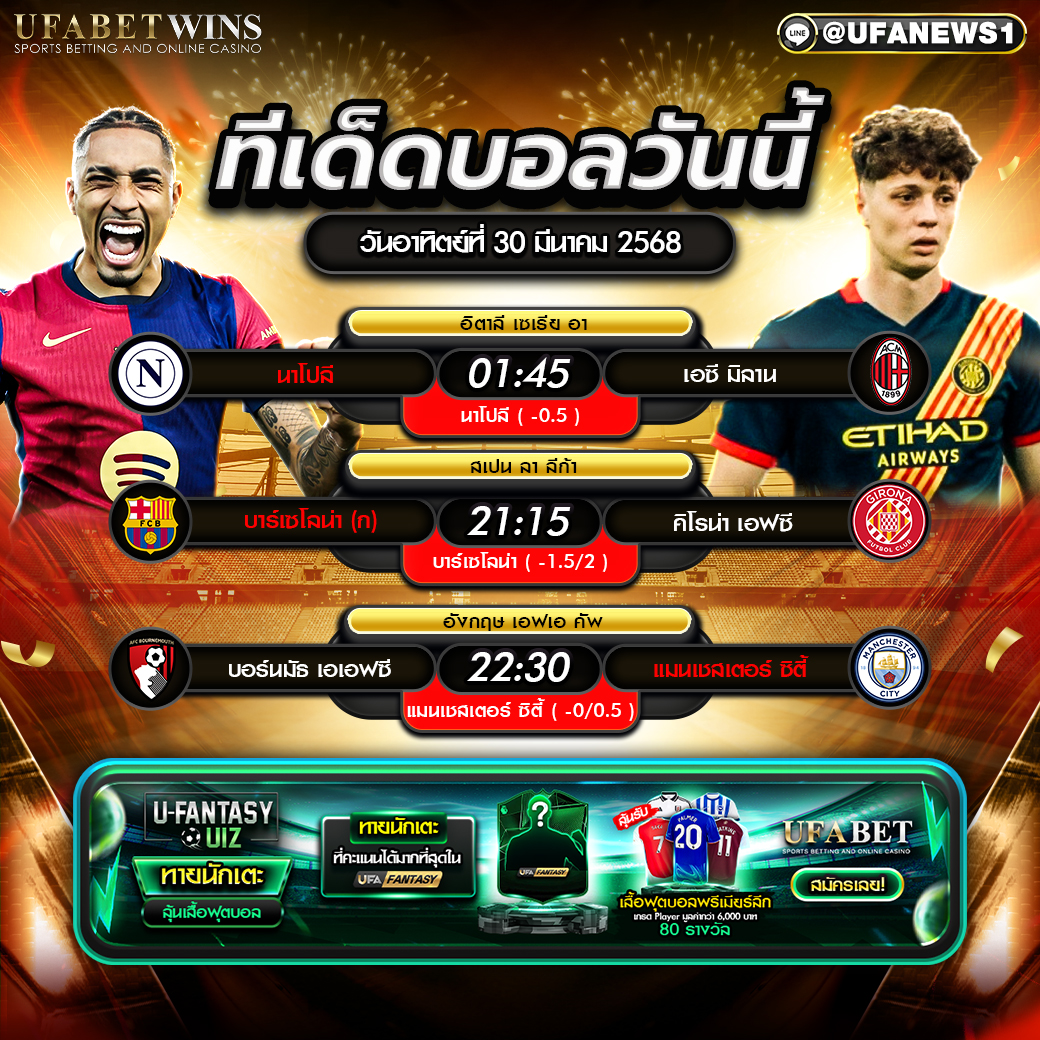 ทีเด็ดบอล วิเคราะห์บอลวันนี้ 30 มีนาคม 2568 คืนนี้มีฟุตบอล ลงแข่งมากพอสมควร UFANEWS คัดมาให้เน้นๆ 3 คู่ ไปดูกันเลย