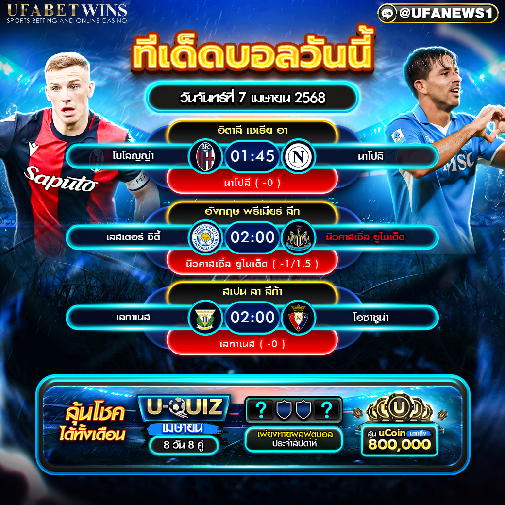 U-QUIZ ทายผลสุ่มฟุตบอลประจำสัปดาห์ 8 วัน 8คู่ ลุ้นUCOIN มากถึง800,000บาท ลุ้นโชคได้ทั้งเดือน สมัครเลย!!