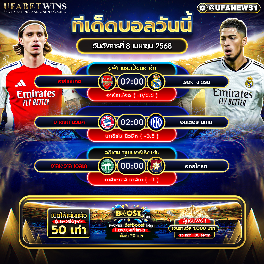 ทีเด็ดบอลคืนนี้ คัดเน้นๆ จัดเต็มสำหรับคอบอลตัวจริง เริ่มต้นกันที่ ศึกยูฟ่า แชมเปี้ยนส์ ลีก เวลา 02:00 น. อาร์เซน่อล เปิดบ้านรับมือ เรอัล มาดริด โดยอัตราต่อรองเปิดมาในราคาต่อเสมอควบครึ่ง (0/0.5) ทีเด็ดคู่นี้แนะนำให้อยู่ฝั่ง อาร์เซน่อล ที่ได้เปรียบจากการเล่นในบ้าน ขณะเดียวกันอีกคู่ในเวลาเดียวกัน บาเยิร์น มิวนิค พบกับ อินเตอร์ มิลาน โดยราคาต่ออยู่ที่ครึ่งลูก (0.5) ทีเด็ดมองว่า บาเยิร์น มิวนิค มีความเขี้ยวและความแน่นอนมากพอที่จะเฉือนคว้าชัยในบ้าน ต่อด้วยฟุตบอล สวีเดน ซุปเปอร์เร็ตเท่น เวลา 00:00 น. วาสเตราส เอสเค จะเปิดบ้านเจอกับ ออร์ไกร์ท โดยราคาต่อเปิดมาที่หนึ่งลูกเต็ม (1.0) ทีเด็ดขอแนะนำให้อยู่ฝั่งต่อ วาสเตราส เอสเค ที่ผลงานในบ้านค่อนข้างน่าไว้ใจ