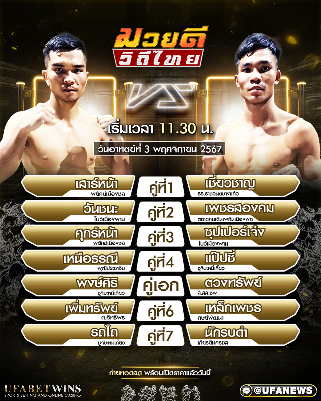 มวยวันนี้ ศึกมวยดีวิถีไทย 3/11/67 เริ่มชกตั้งแต่เวลา 11:30 น.