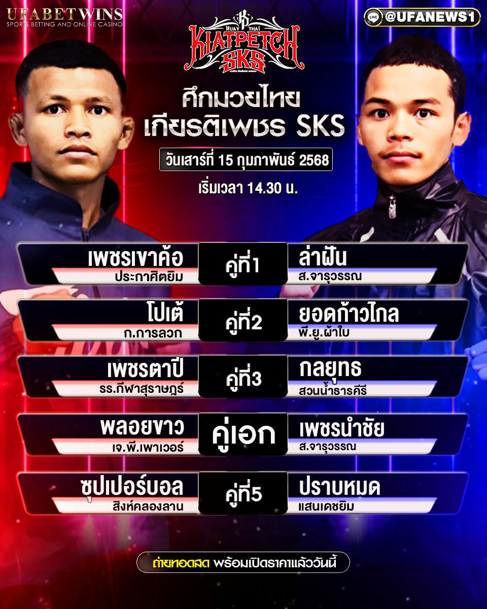 ติดตาม ตารางมวยไทยวันนี้ พร้อมลิงก์ ดูมวยสด ทุกคู่ทุกสนาม ไม่ว่าจะเป็นมวยไทยหรือ มวยสเต็ป ก็สามารถรับชม ถ่ายทอดสดมวยไทยล่าสุด และ วิเคราะห์มวยวันนี้ ได้ที่นี่ นอกจากนี้ยังมี ทีเด็ดมวยแม่นๆ ให้คุณเลือก แทงมวยไทยออนไลน์ กับ เว็บแทงมวยที่ดีที่สุด อย่าง UFANEWS ที่มีอัตราต่อรองดีที่สุด และเปิดให้ แทงมวยสด ทุกสนามทุกสังเวียน ดู ไฮไลท์มวยไทย ย้อนหลังและร่วมสนุกกับการ เดิมพันมวยไทยออนไลน์ ที่เชื่อถือได้ สมัครแทงมวยวันนี้ เพื่อรับประสบการณ์ที่ครบวงจรกับ เว็บเดิมพันมวยที่ดีที่สุดในประเทศไทย