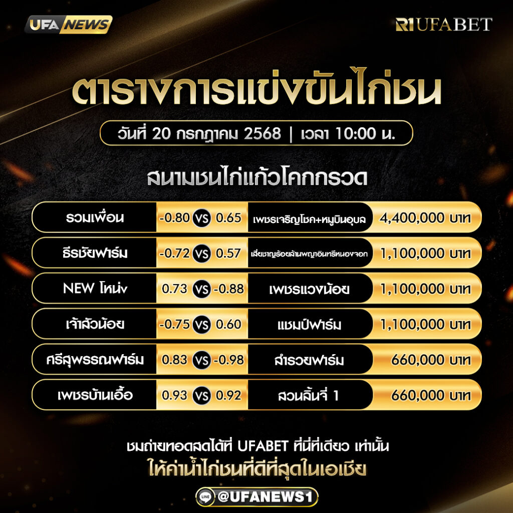 โปรแกรมการแข่งขันไก่ชน วันที่ 20 กรกฎาคม 2568