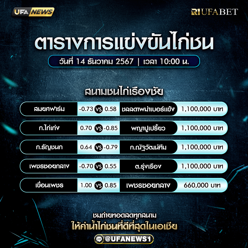 โปรแกรมการแข่งขันไก่ชน วันที่ 14 ธันวาคม 2567