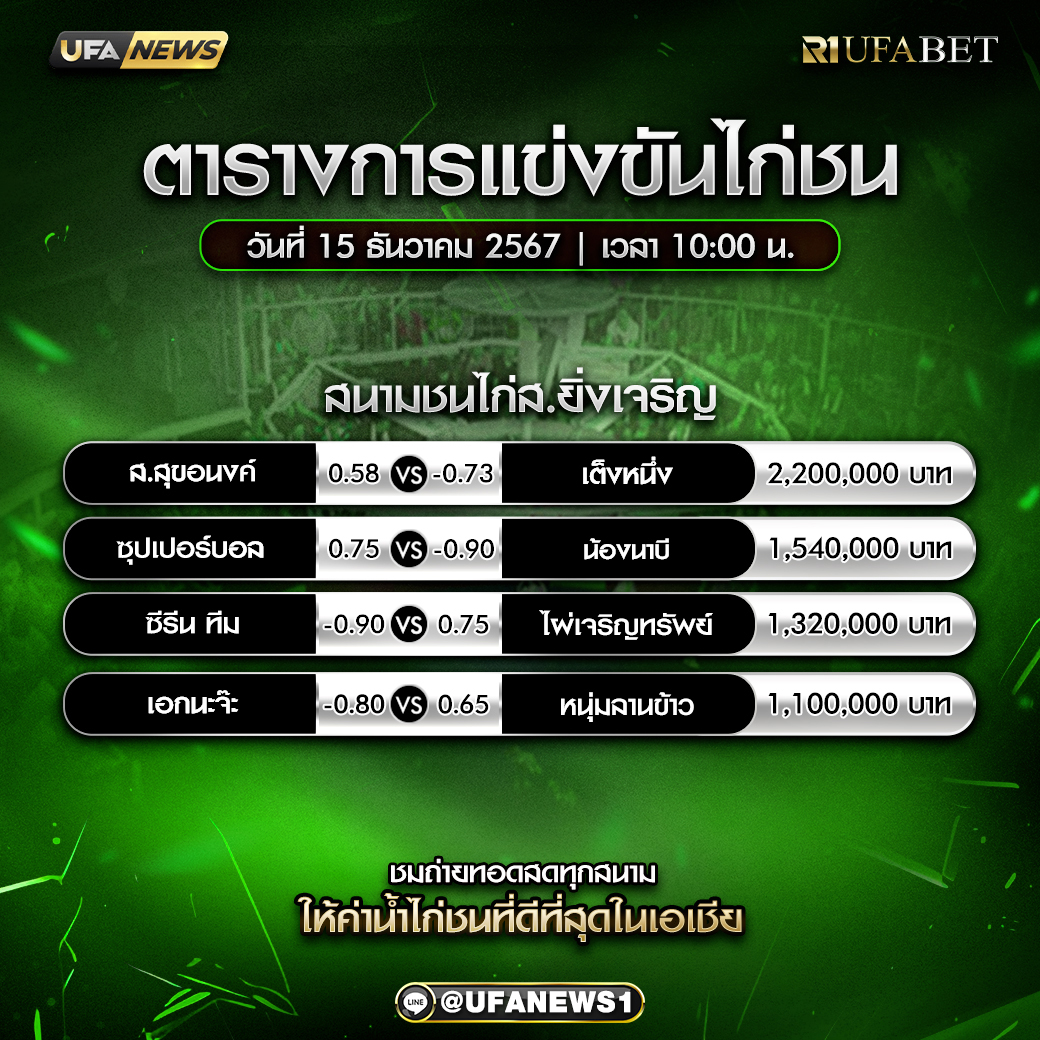 โปรแกรมการแข่งขันไก่ชน วันที่ 15 ธันวาคม 2567