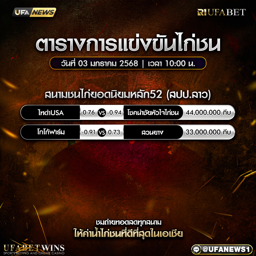 โปรแกรมการแข่งขันไก่ชน วันที่ 3 มกราคม 2568