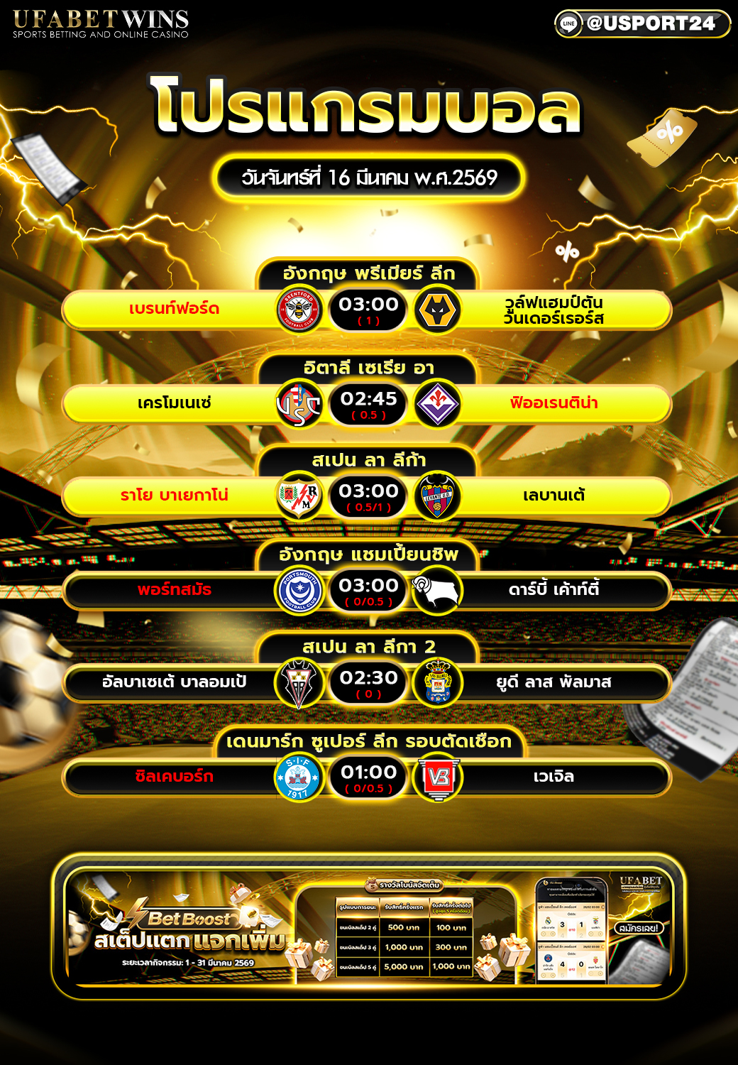 คืนวันจันทร์ที่ 16 มีนาคม 2569 มีโปรแกรมฟุตบอลทั้งหมด 6 คู่ จาก 6 รายการ ประกอบด้วยพรีเมียร์ลีก อังกฤษ, เซเรีย อา อิตาลี, ลา ลีก้า สเปน, แชมเปี้ยนชิพ อังกฤษ, ลา ลีกา 2 และเดนมาร์ก ซูเปอร์ ลีก รอบตัดเชือก ซึ่งถือว่าเป็นคืนที่มีความหลากหลายของลีกค่อนข้างมาก แม้จำนวนคู่จะไม่เยอะเท่าบางวัน แต่เพียงพอสำหรับแฟนบอลที่ต้องการติดตามเกมแบบต่อเนื่องตลอดช่วงดึก