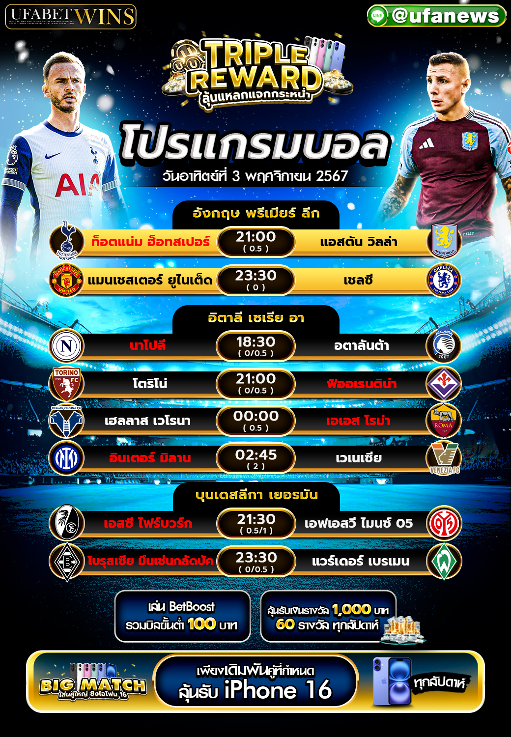 โปรแกรมฟุตบอลวันนี้ 03/11/2567