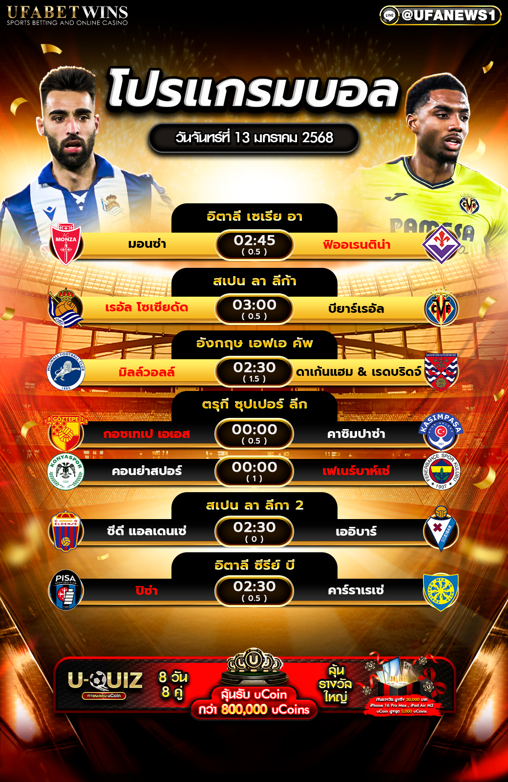 โปรแกรมฟุตบอลวันนี้ 13/01/2568