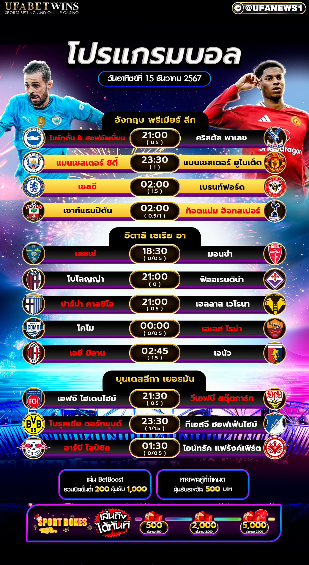 โปรแกรมฟุตบอลวันนี้ 15/12/2567
