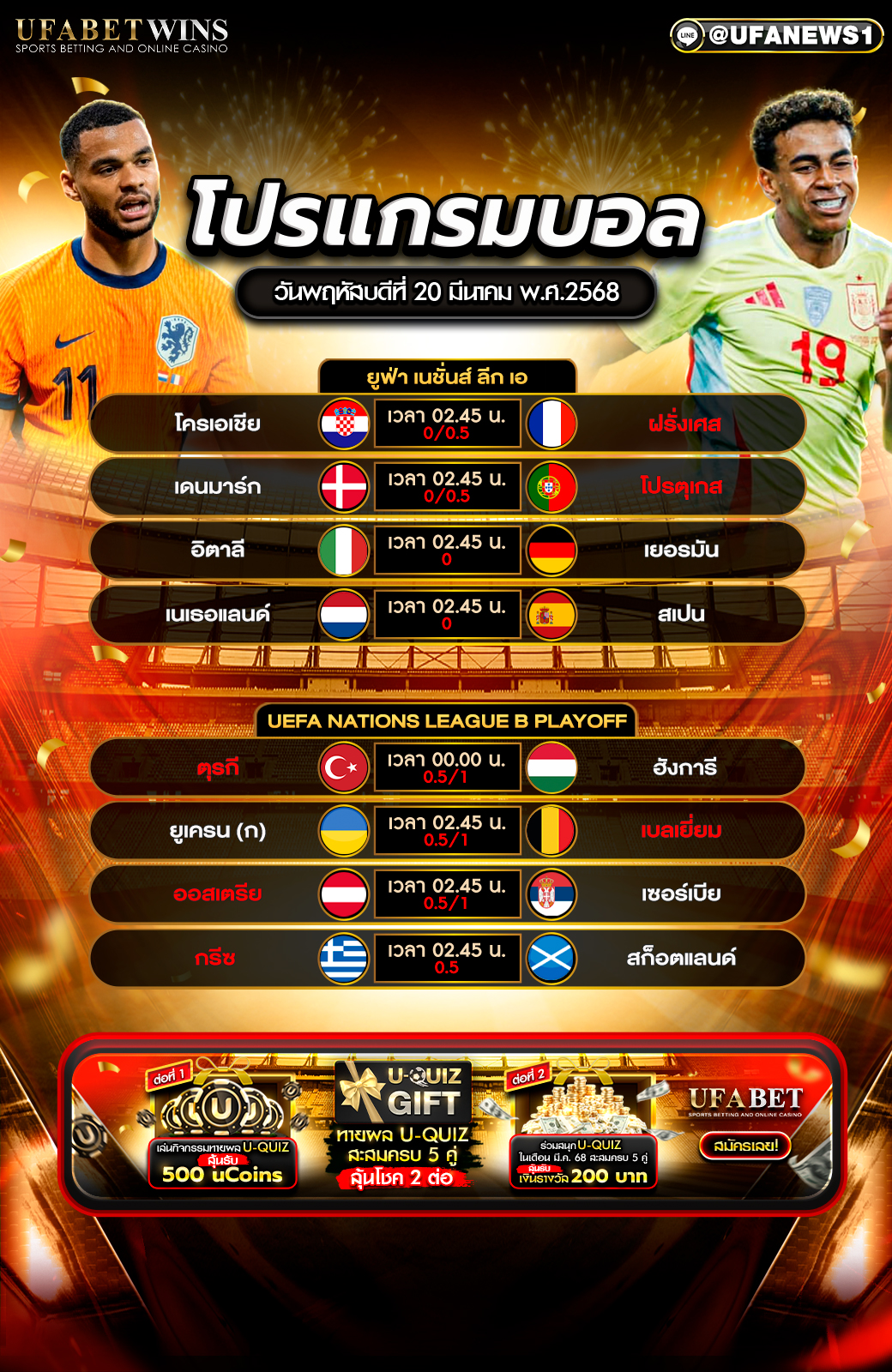 โปรแกรมฟุตบอลวันนี้ 20 มีนาคม 2568