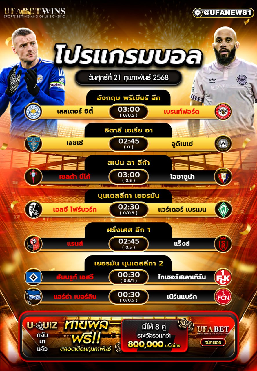 โปรแกรมฟุตบอลวันนี้ 21/02/2568 เตรียมพร้อมสำหรับการแข่งขันฟุตบอลสุดมันส์คืนนี้