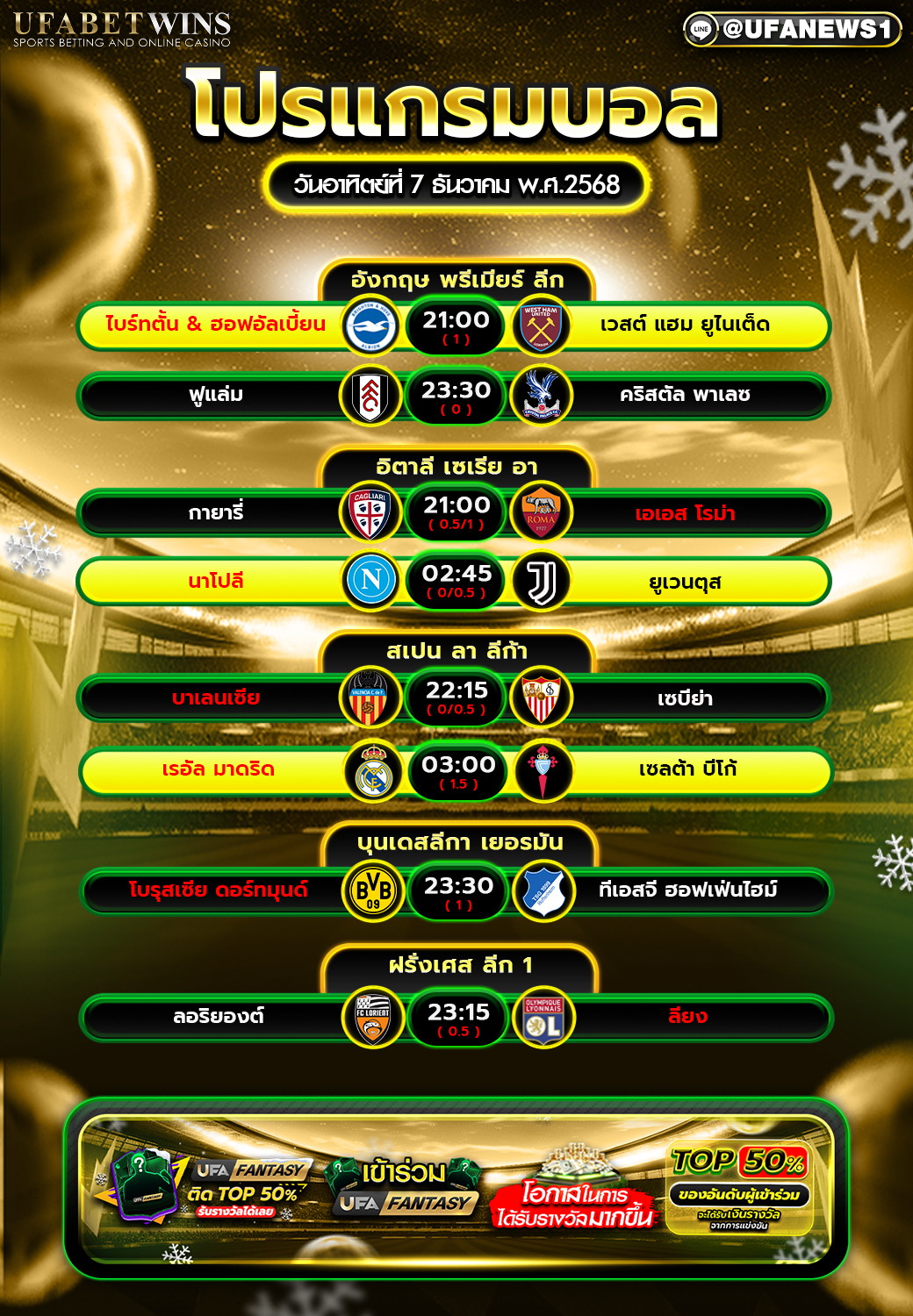 ภาพรวมโปรแกรมฟุตบอลค่ำคืนวันอาทิตย์ที่ 7 ธันวาคม 2568