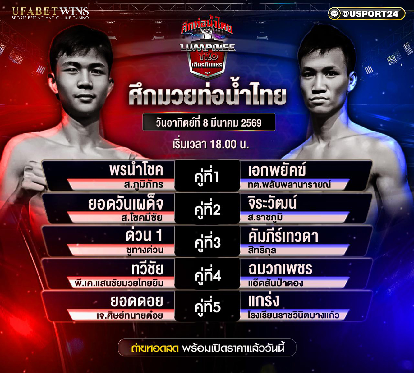 1. ศึกท่อน้ำไทยเกียรติเพชรทีเคโอ วันที่ 8 มีนาคม 2569 จัดขึ้นที่ไหนและกี่โมง