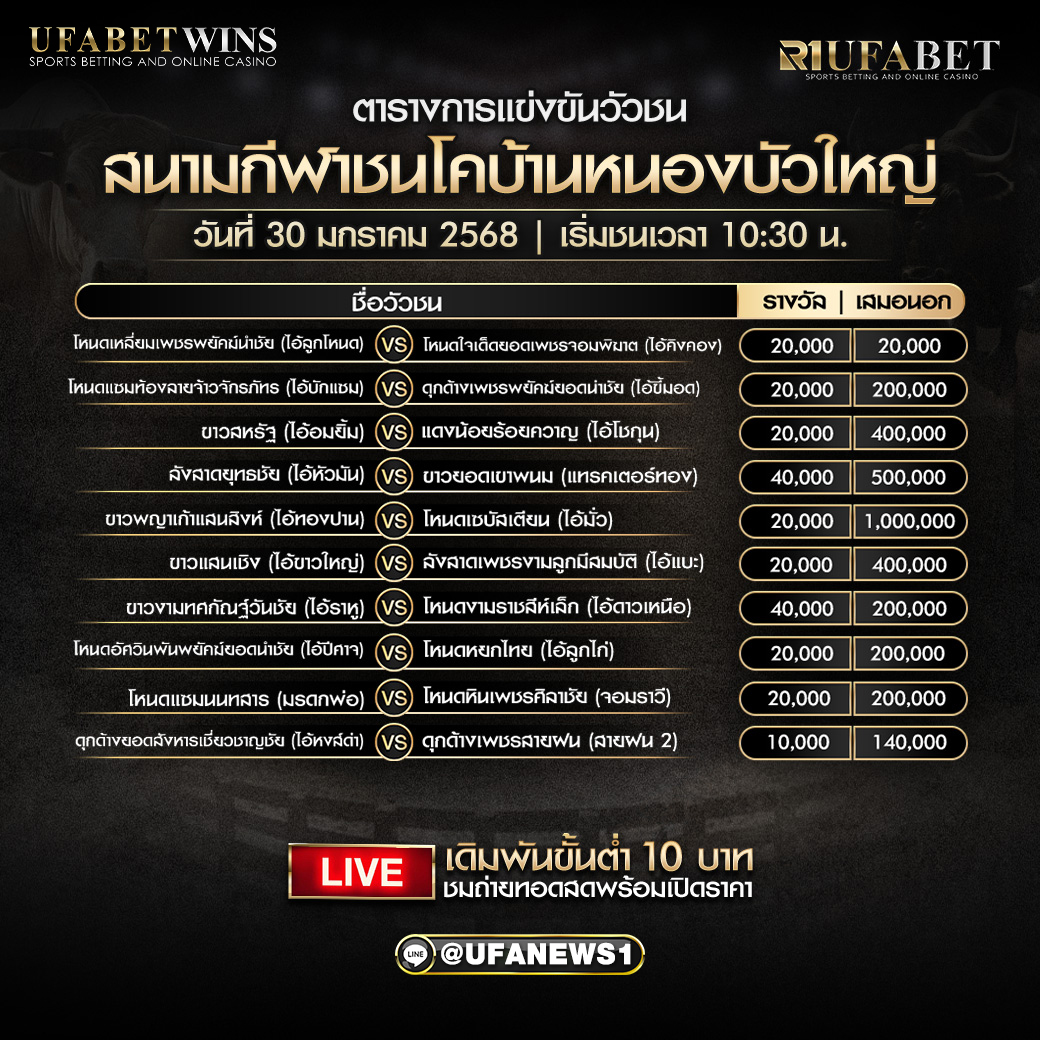โปรแกรมวัวชน สนามกีฬาชนโคบ้านหนองบัวใหญ่ วันที่ 30 มกราคม 2568