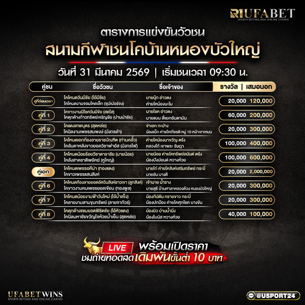 การแข่งขันในครั้งนี้กำหนดจัดขึ้นในวันที่ 31 มีนาคม 2569 และเริ่มเวลา 10.00 น. ที่สนามชนโคบ้านหนองบัวใหญ่ ภาพรวมของรายการถือว่ามีความคึกคักตั้งแต่ช่วงเปิดสนาม เพราะมีทั้งคู่ก่อนเวลา คู่เงินระดับกลาง คู่เงินสูง และคู่เอกที่มีตัวเลขเสมอนอกโดดเด่นที่สุดของวัน ทำให้โปรแกรมทั้งวันมีจังหวะความน่าสนใจต่อเนื่องตั้งแต่ต้นจนจบรายการ