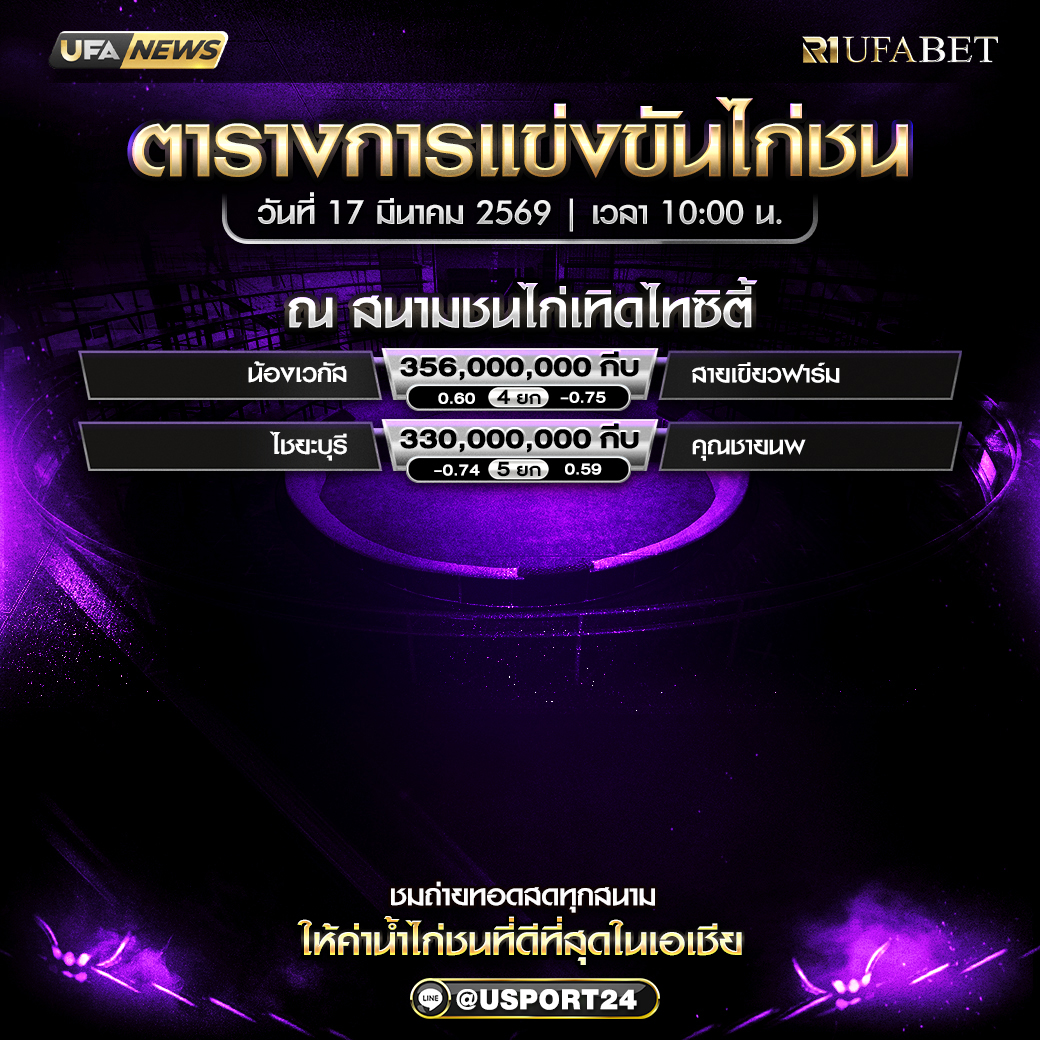 ตารางโปรแกรมไก่ชน สนามชนไก่เทิดไทซิตี้ 17 มี.ค. 2569