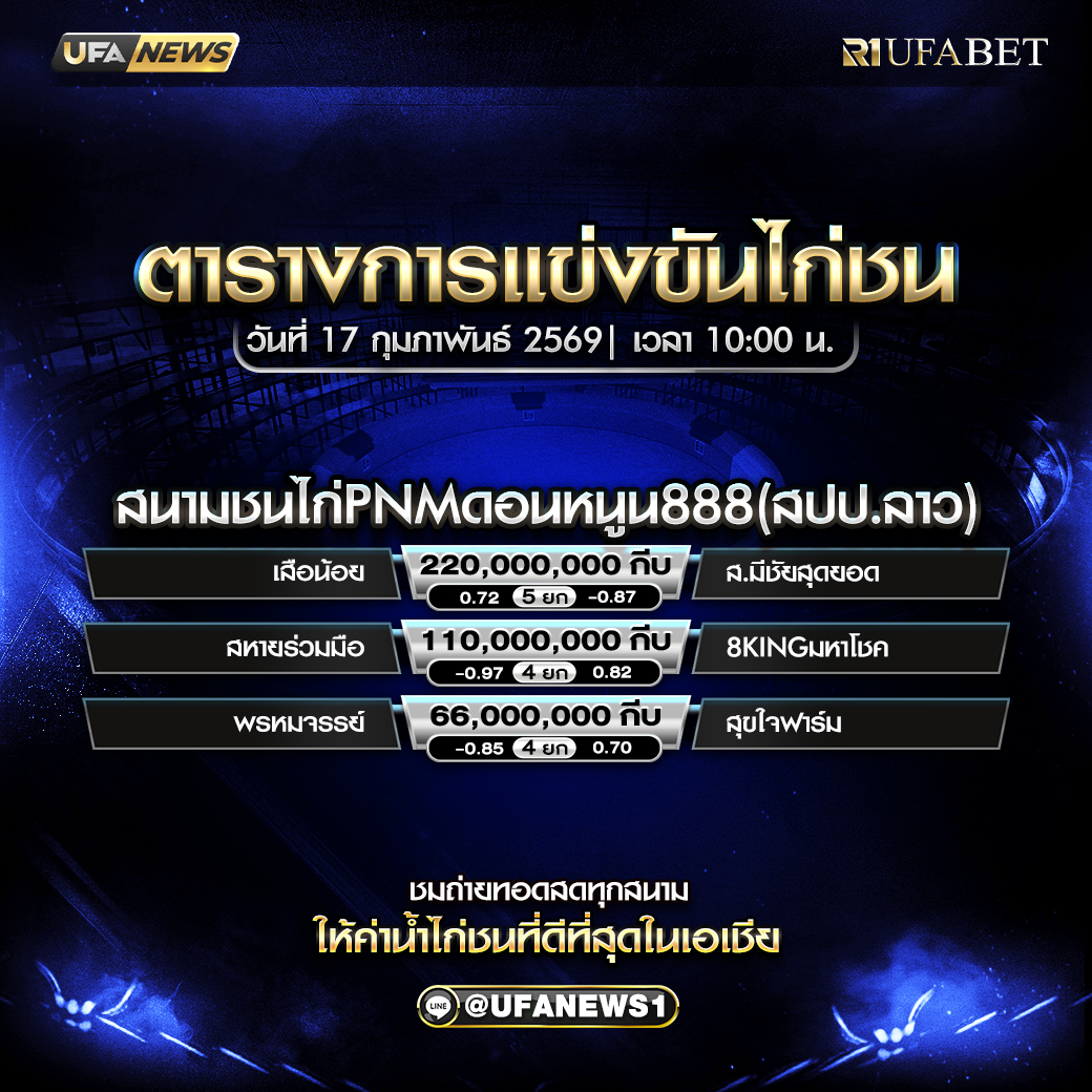 สรุปโปรแกรมไก่ชน สนามชนไก่PNMดอนหนูน888 (สปป.ลาว) 17 กุมภาพันธ์ 2569