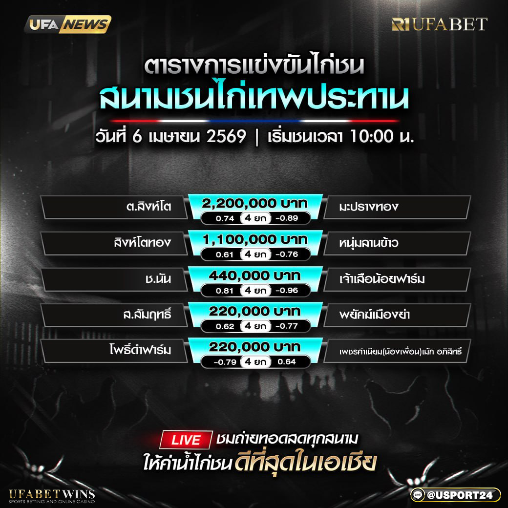 รายการแข่งขันประจำวันจันทร์ที่ 6 เมษายน พ.ศ. 2569 ของสนามชนไก่เทพประทานในครั้งนี้ มีการจัดคู่แข่งขันทั้งหมด 5 คู่ โดยแต่ละคู่มีข้อมูลครบทั้งฝั่งแดง ฝั่งน้ำเงิน อัตราต่อรอง และเงินรางวัลอย่างชัดเจน ซึ่งถือเป็นองค์ประกอบสำคัญของหน้ารวมโปรแกรม เพราะผู้อ่านส่วนใหญ่มักต้องการดูภาพรวมแบบสแกนเร็วก่อน จากนั้นจึงค่อยเลื่อนอ่านรายละเอียดรายคู่ในลำดับถัดไป บทความนี้จึงออกแบบเนื้อหาให้เริ่มต้นจากสรุปภาพรวม แล้วค่อยลงลึกสู่รายละเอียดแต่ละคู่ตามลำดับ เพื่อช่วยให้การติดตามโปรแกรมประจำวันทำได้ง่ายและต่อเนื่องยิ่งขึ้น