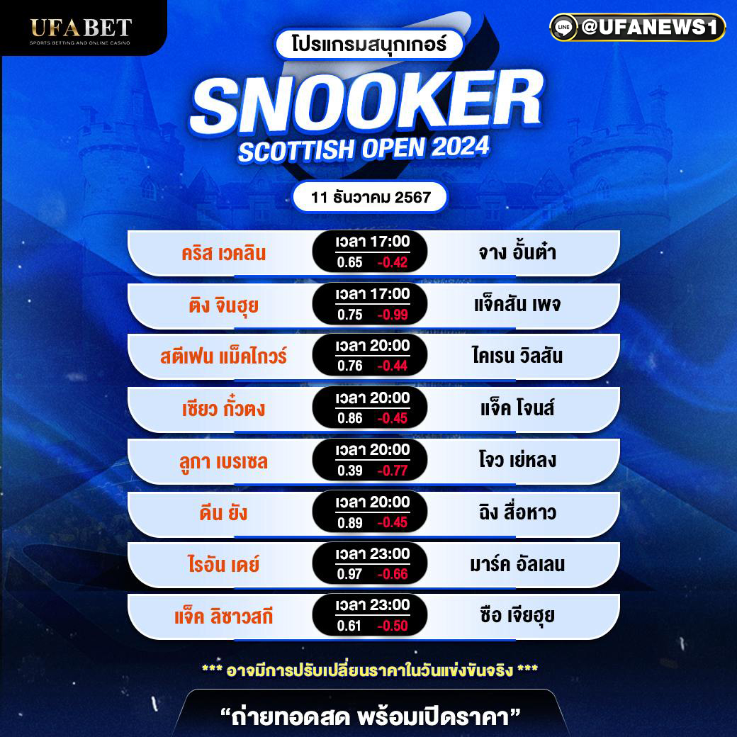 โปรแแกรมสนุกเกอร์ ประจำวันที่ 11 ธันวาคม 2567 รายการแข่งขันสนุกเกอร์ สก็อตติช โอเพ่น