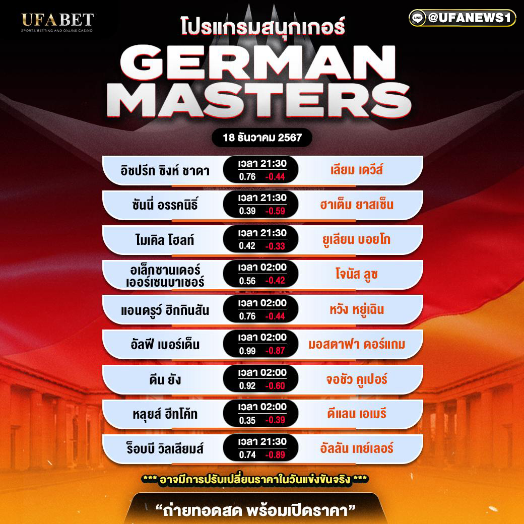 โปรแแกรมสนุกเกอร์ ประจำวันที่ 18 ธันวาคม 2567 รายการแข่งขันสนุกเกอร์ เยอรมัน มาสเตอร์ส